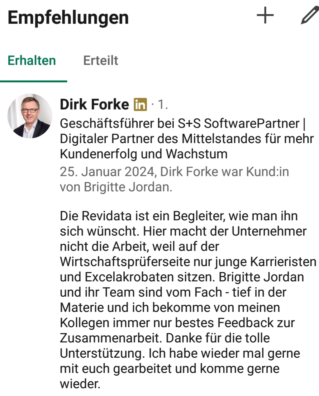 Immer wieder freuen wir uns über positive Reaktionen unserer Kunden. Anerkennende Einschätzungen zu unseren durchgeführten Projekten und Weiterempfehlungen, die wir bisher nicht weiter veröffentlicht haben. Diese anerkennende Empfehlung macht uns aber so stolz, dass wir sie nicht nur für uns behalten wollen. Es betrifft unsere Dienstleistung „Prüfung und Bescheinigung der Ordnungsmäßigkeit, und Gesetzeskonformität gemäß dem Prüfungsstandard des Institutes der Wirtschaftsprüfer in Deutschland e.V. IDW PS 880 von Anwendungssystemen“.